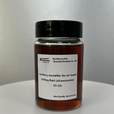 该辅乳化剂可用于配置柴油基钻井液、白油基钻井液、合成基钻井液,具有加量少,乳化能力强,破乳电压高,可生物降解等优点。